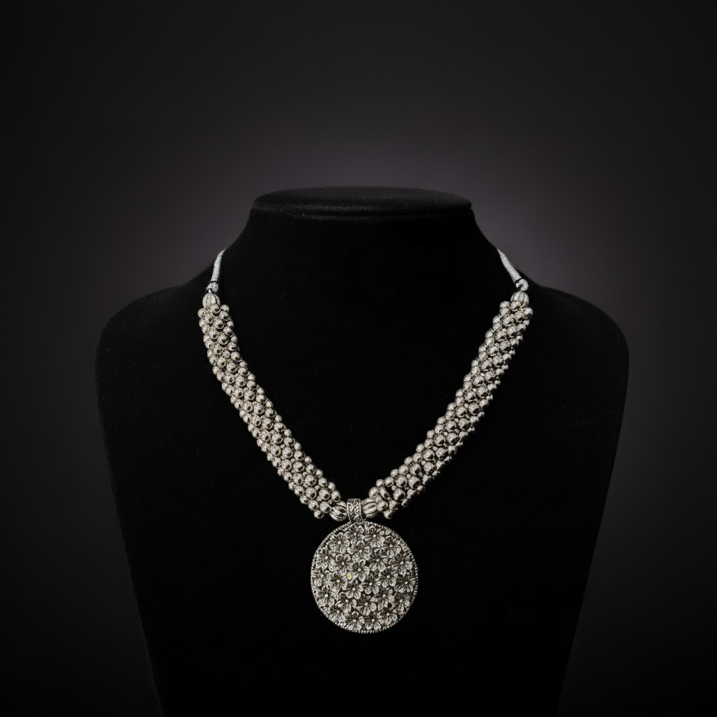 This piece is a traditional oxidized silver necklace with a three-layer beaded chain and a large circular floral pendant — a design rooted in tribal and antique Indian craftsmanship. The clustered silver beads represent strength and unity, while the pendant's intricate floral pattern symbolizes purity and resilience.