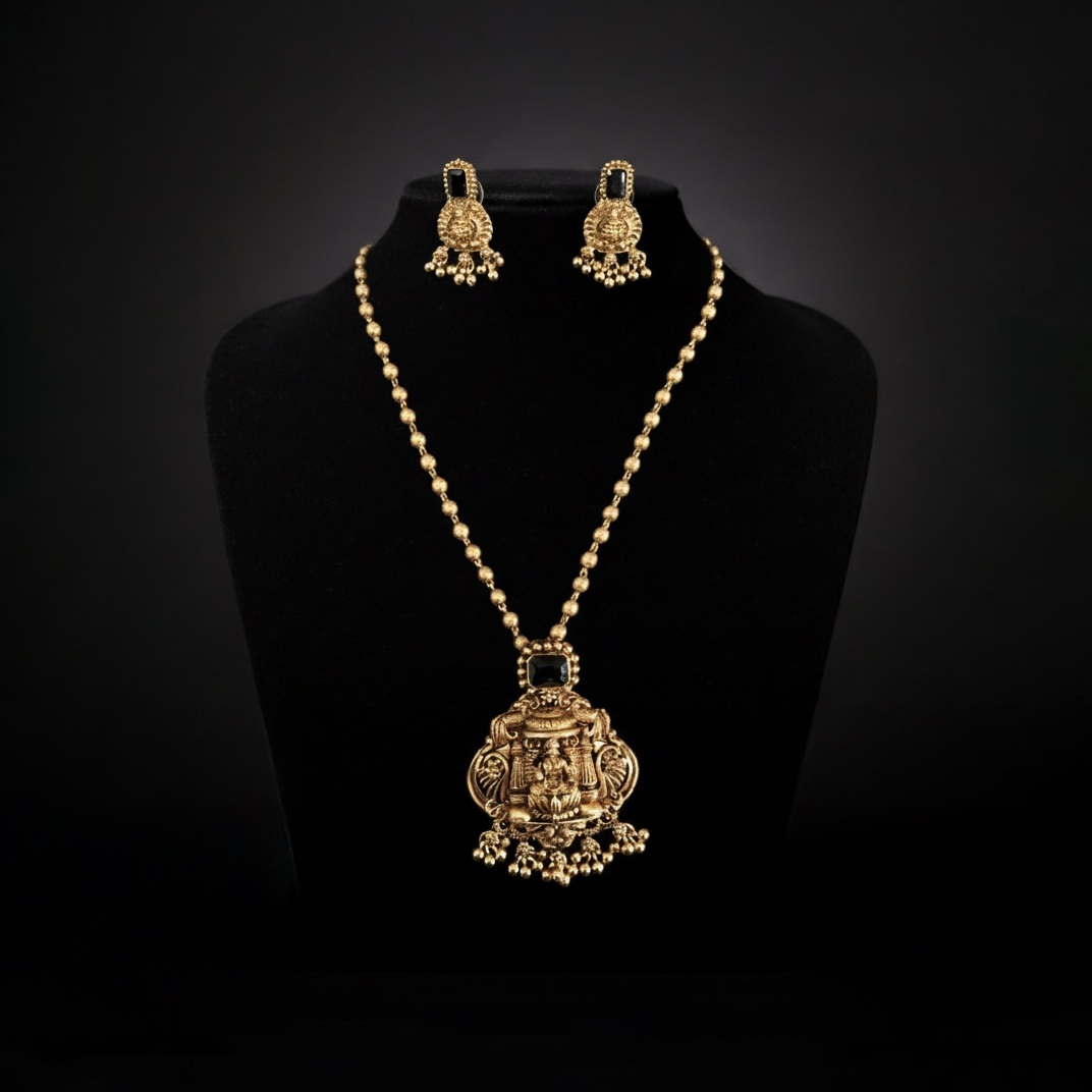 Embrace sacred elegance with this stunning antique gold-tone set. Featuring a beautifully detailed Goddess Lakshmi pendant, complete with matching earrings, this exquisite piece celebrates divine beauty and prosperity. Finished with rich black stones and delicate dangling beads, this set is a true statement of tradition and style that honors the goddess of wealth and abundance.
