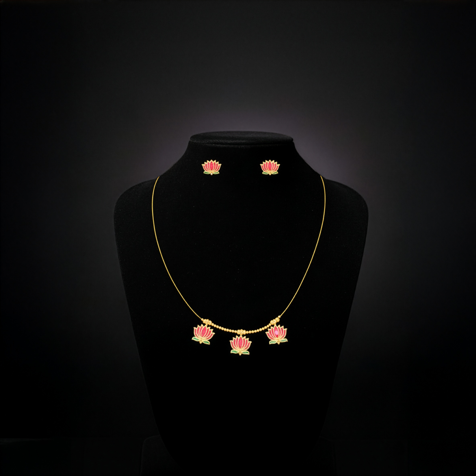 This beautiful jewelry set is characterized by the elegant lotus flower design, crafted from gold-toned metal with exquisite enamel work. The necklace features a delicate chain with a small cluster of three lotus flower pendants suspended gracefully, while the matching earrings showcase lotus flower studs that complete this harmonious set.