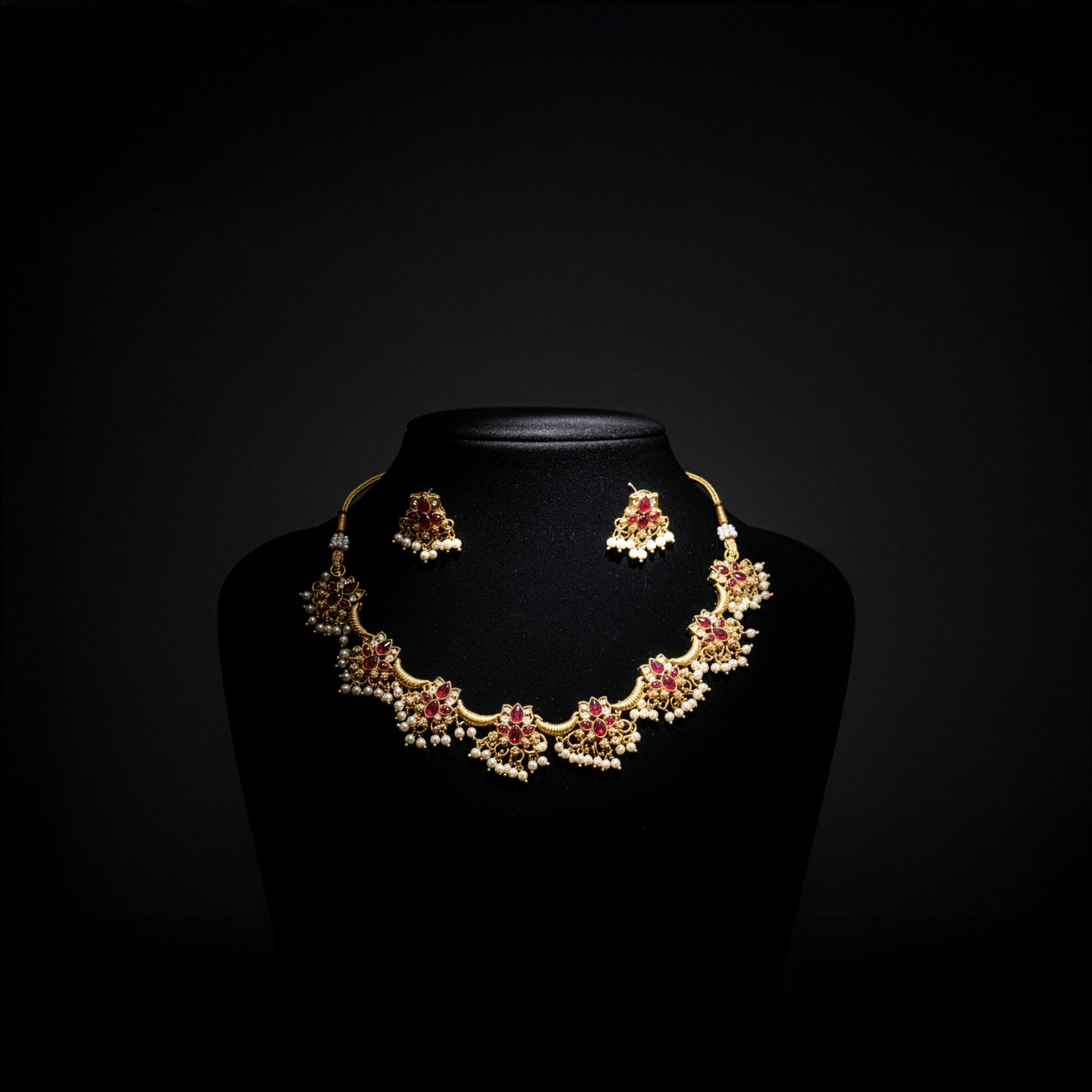 Exquisite choker necklace and matching stud earrings set in traditional Temple Jewelry style. This stunning Kundan/Polki inspired piece features gold-tone metal with an elegant antique matte finish. The necklace showcases elaborate floral and paisley motifs, beautifully adorned with vibrant maroon ruby-colored stones and delicate pearl seed bead accents. Each piece is meticulously handcrafted to capture the essence of traditional Indian jewelry artistry.
